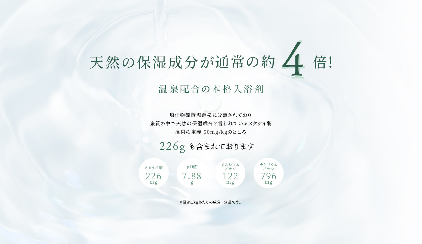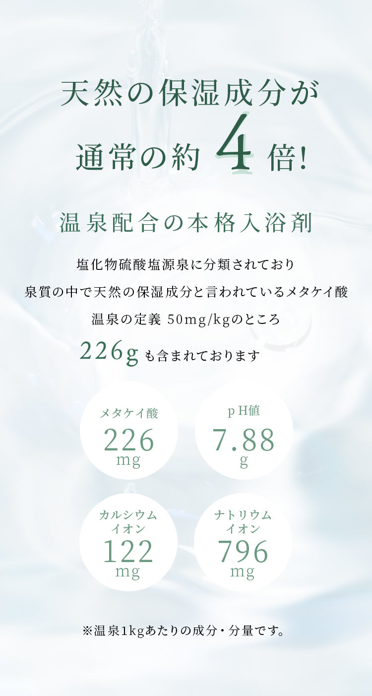 セラミドを保つメタケイ酸、カルシウムイオン等、美肌の湯の主要成分をたっぷり配合。ミネラル補給をしながら、潤い、保湿でつるすべ肌をサポート、継続使用でエイジングケア。
