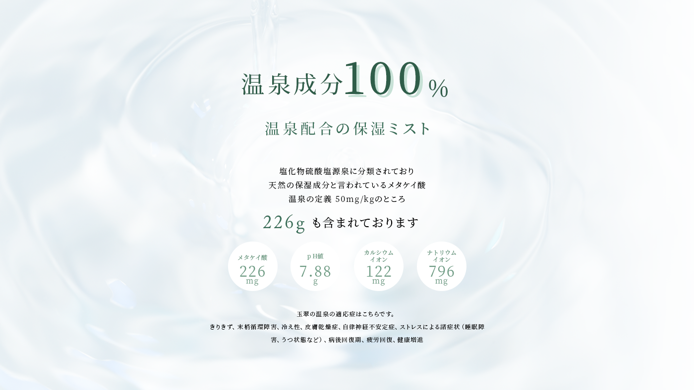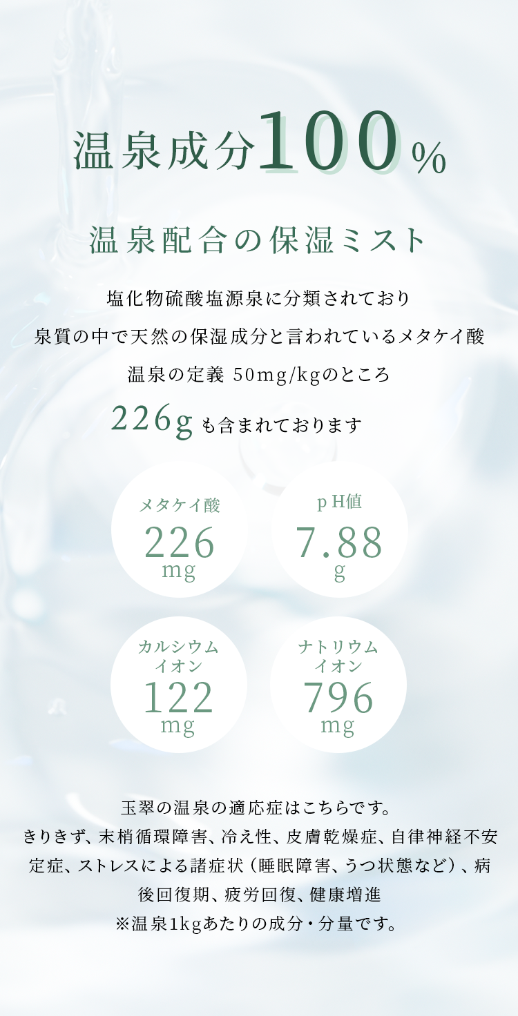 伊豆熱川にある玉翠の自家源泉は、お肌に嬉しい多くの天然成分を含み、美人の湯と称されています。百年以上、延べ百万人以上の方に、それをご体感いただいています。この温泉ミストは、その方々と同じ体感ができる、温泉成分100%のオーガニック化粧水です。