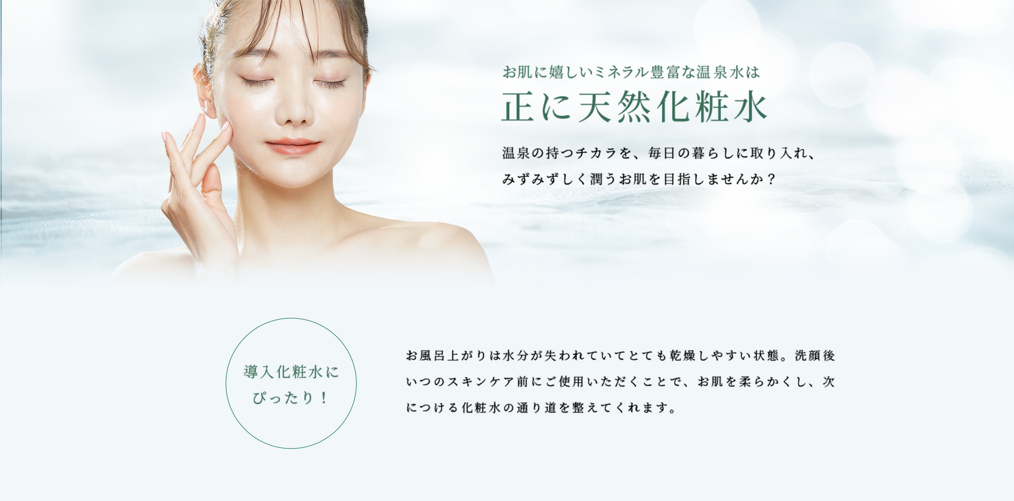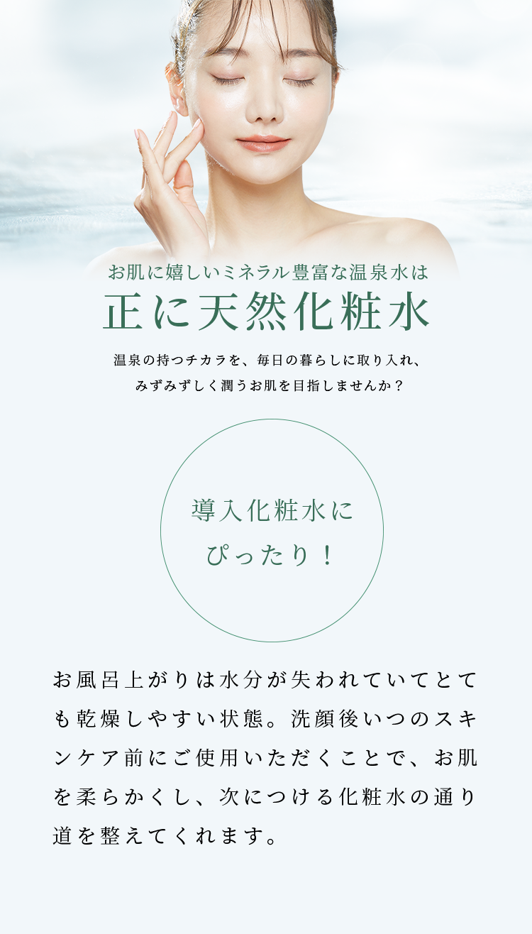 自家源泉からの温泉を100%配合した、オーガニック化粧水です。スプレー式で温泉をミスト状に噴霧するので、温泉化粧水が肌に浸透するのをよりサポートします。