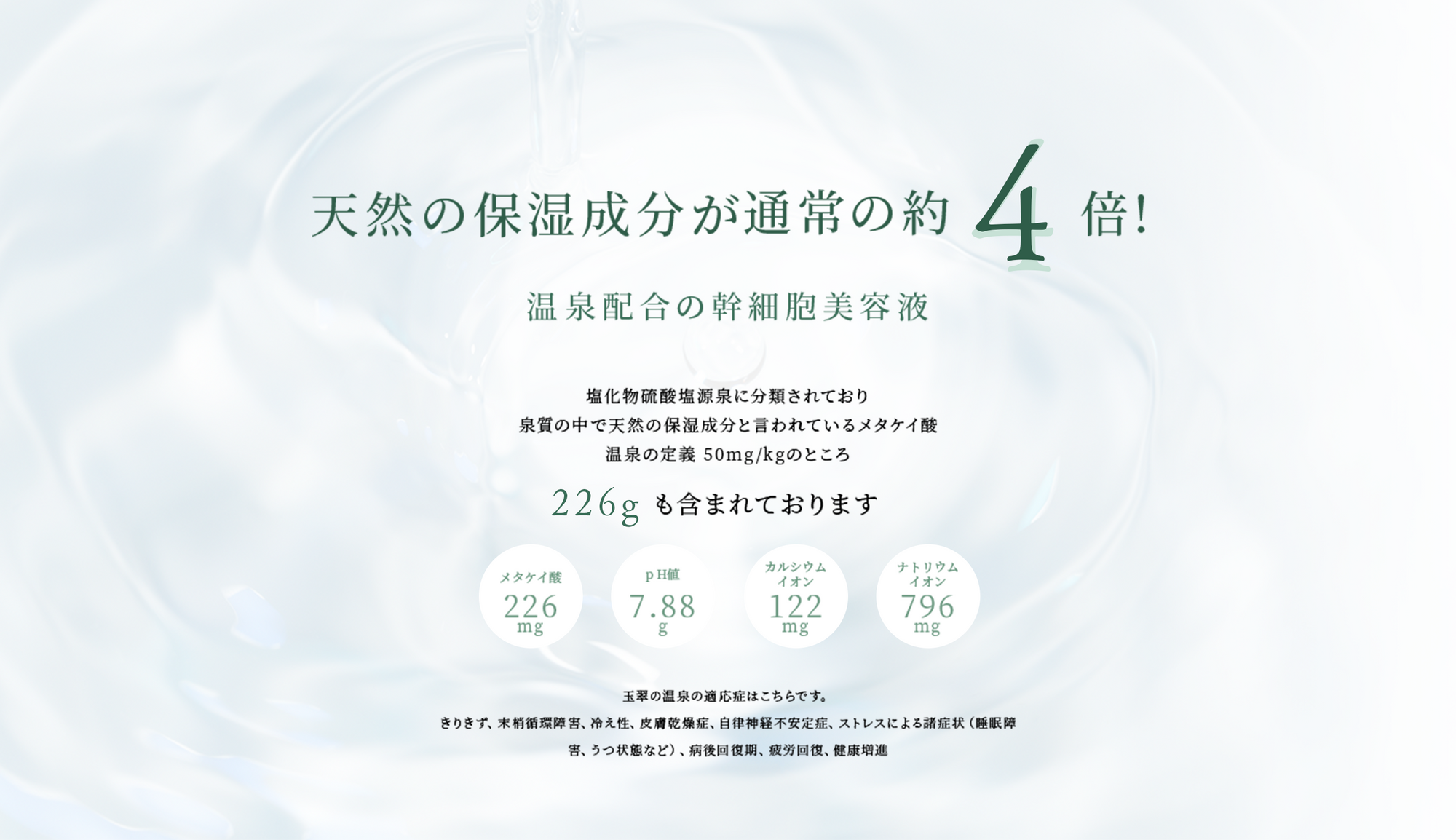 - 【玉翠 美人の湯】自家源泉からの温泉は美肌成分豊富です。炭酸水素イオン メタケイ酸カルシウムイオン等の天然成分がお肌の弾力 ハリを高め、キメを整え、ふっくら滑らかにして、潤い補給。健やかな肌をサポート