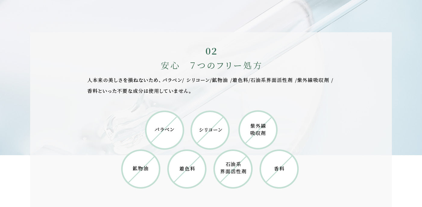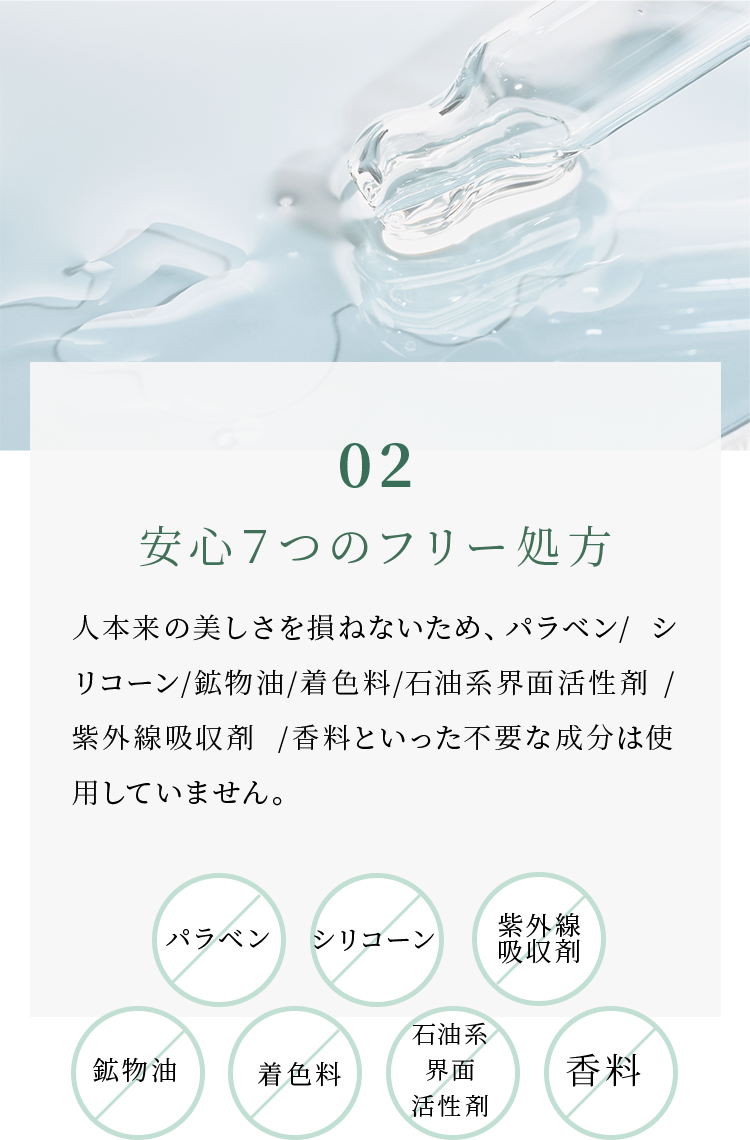 - 【安全安心の7つのフリー】パラベン シリコーン 鉱物油 着色料 石油系界面活性剤 紫外線吸収剤 香料フリー