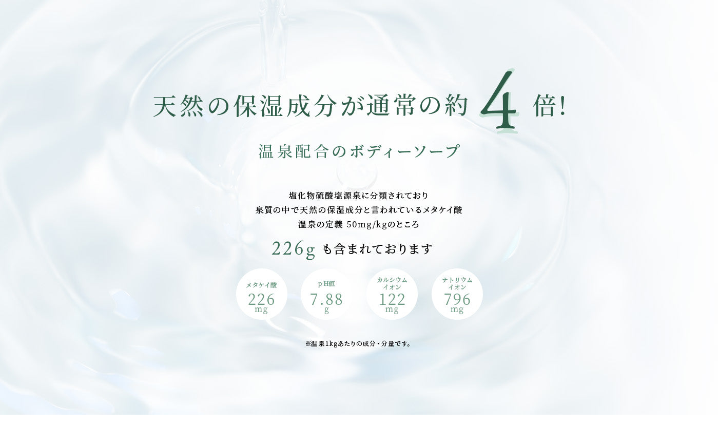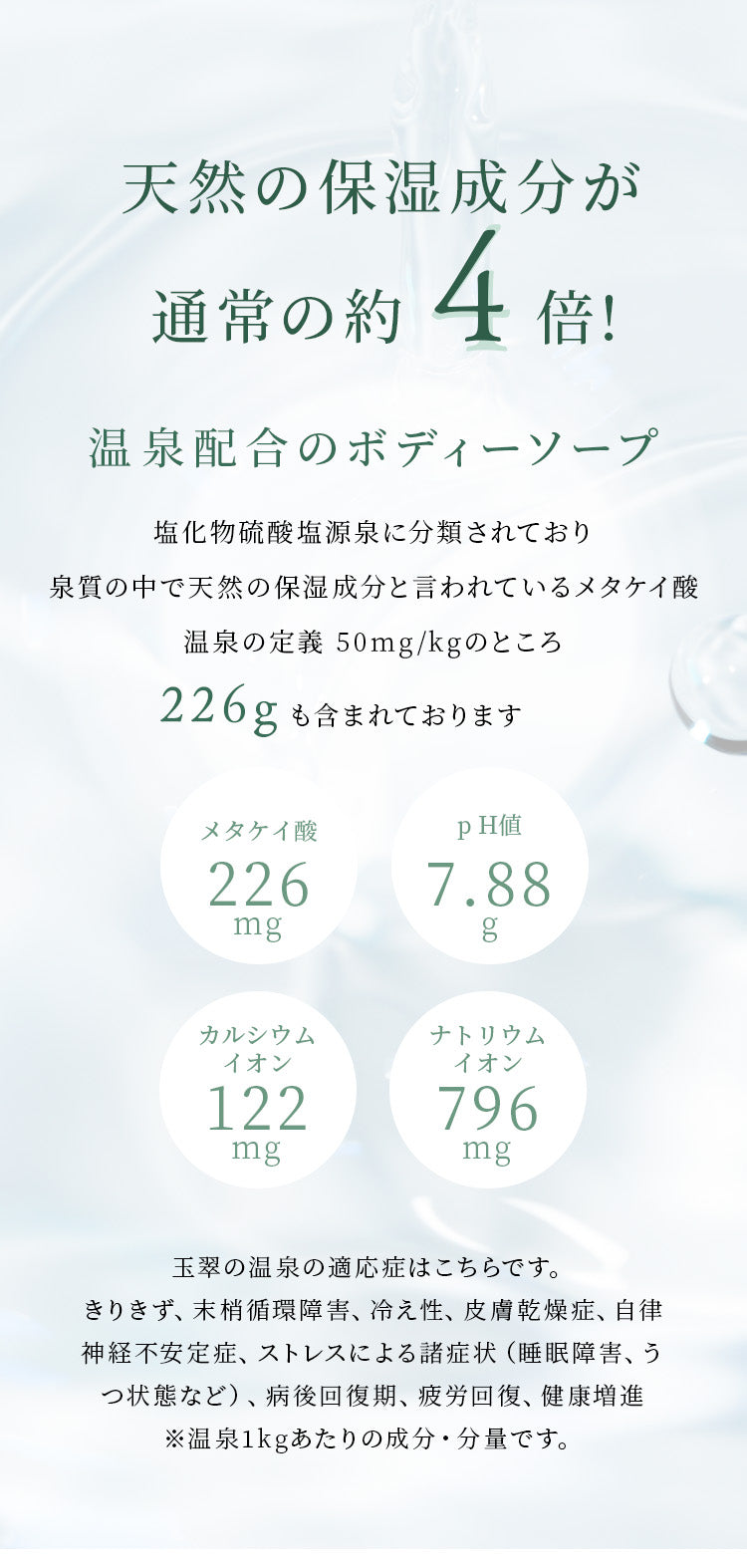 伊豆熱川の玉翠の自家源泉から湧出する天然温泉を配合しています。特に当温泉成分に豊富な「メタケイ酸」「カルシウムイオン」はお肌をしっとりさせ、ハリ・ツヤを与えてくれます。